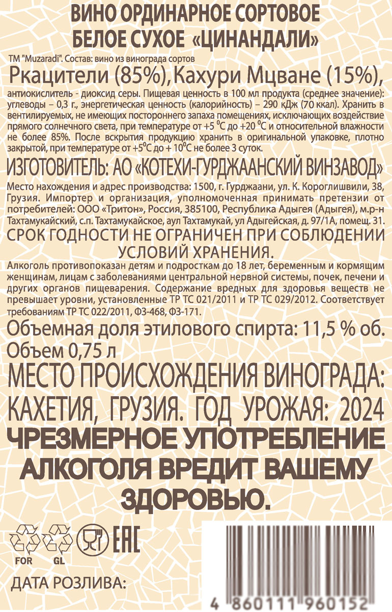 Вино Muzaradi Цинандали белое сухое 0,75 л