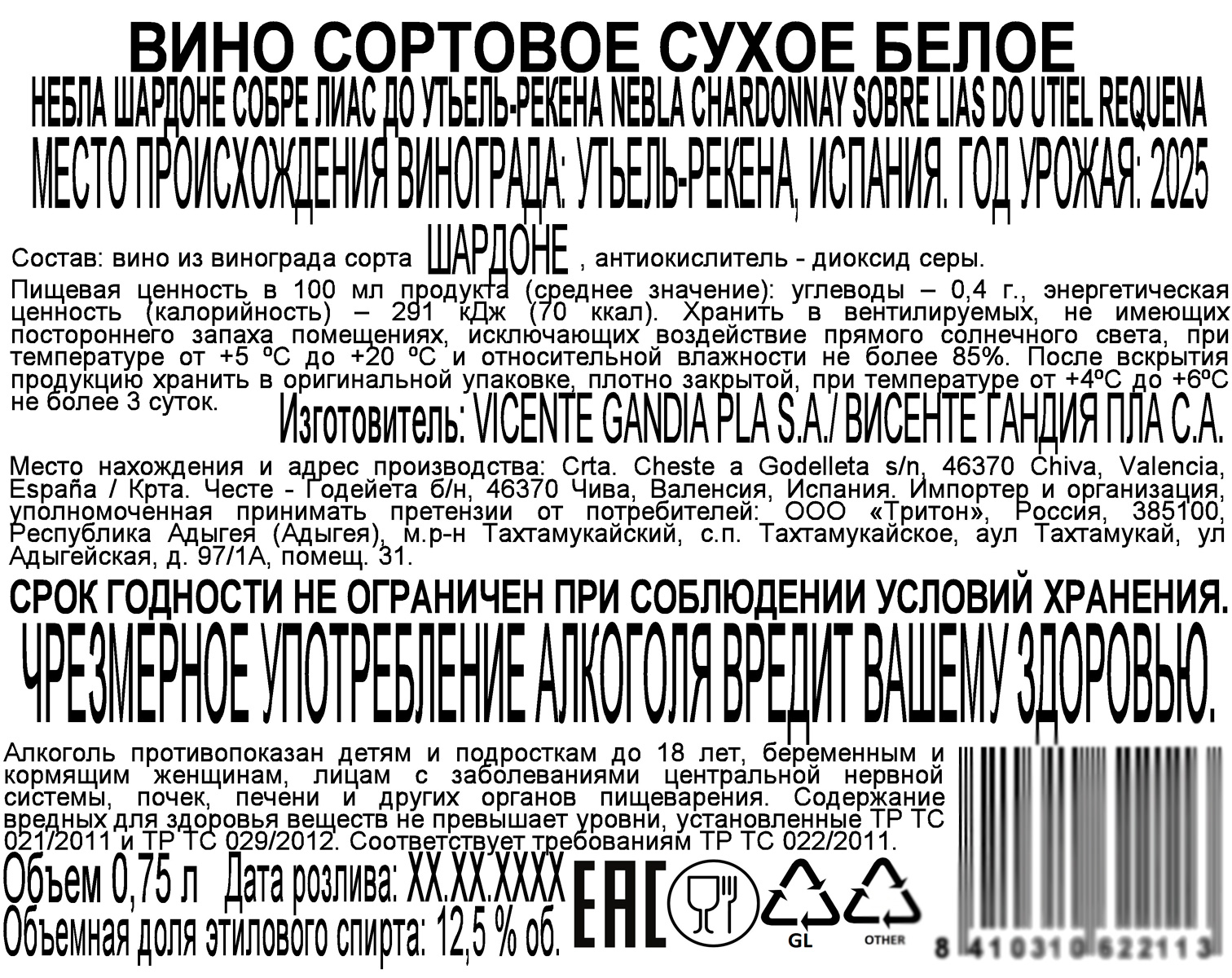Вино Небла Шардоне Собре Лиас белое сухое 0,75 л