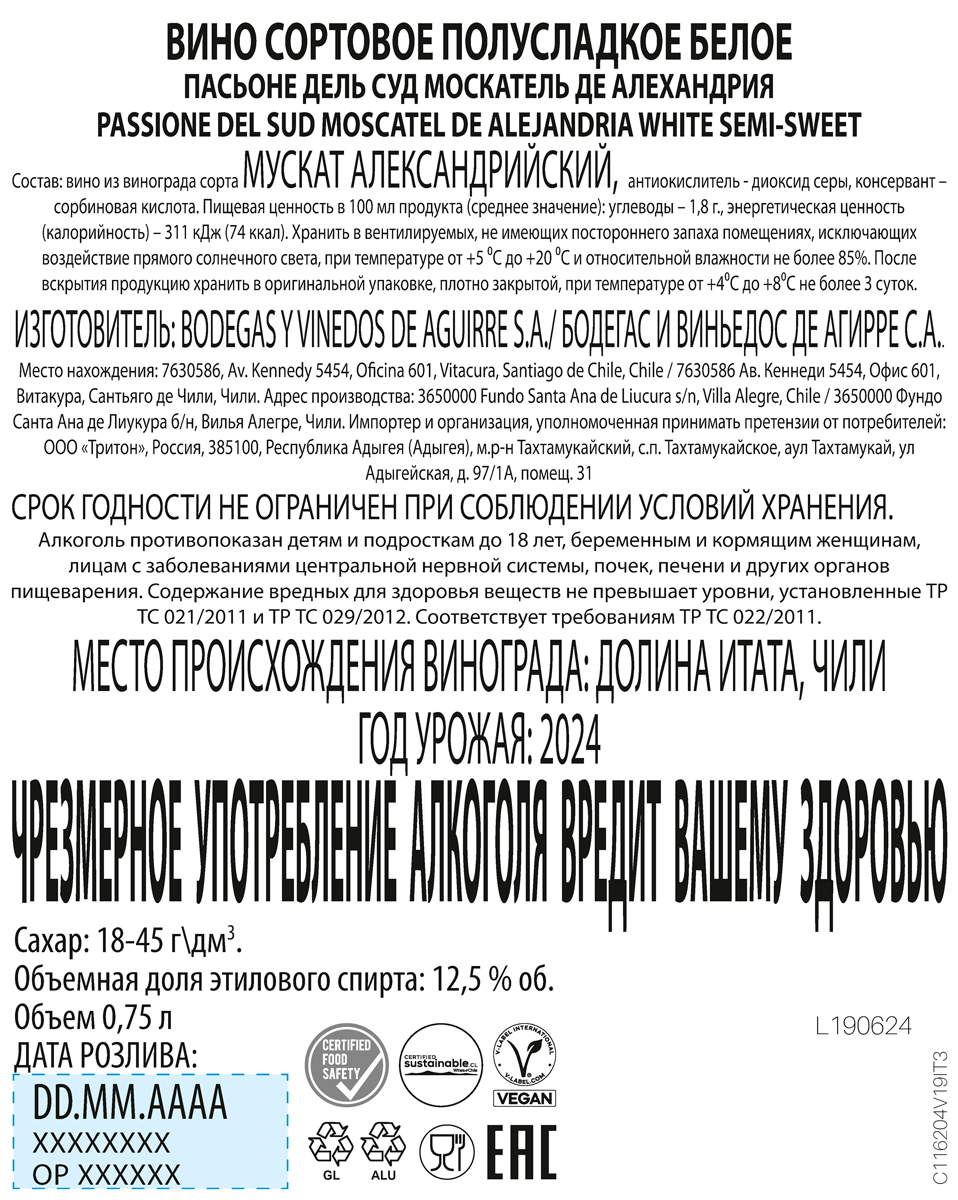 Вино Пасьоне Дель Суд Москатель де Алехандрия белое полусладкое 0,75 л