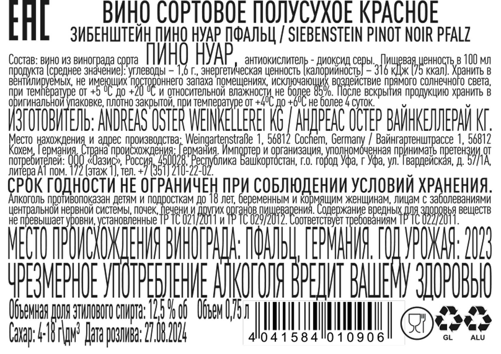 Вино Зибенштейн Пино Нуар Пфальц красное полусухое 0,75 л