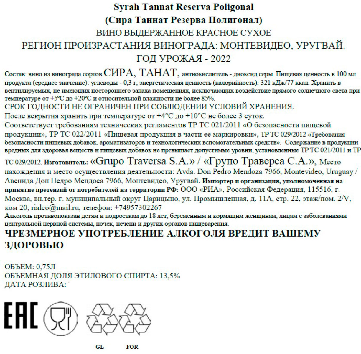 Вино Полигонал Сира Таннат Резерва красное сухое 0,75 л