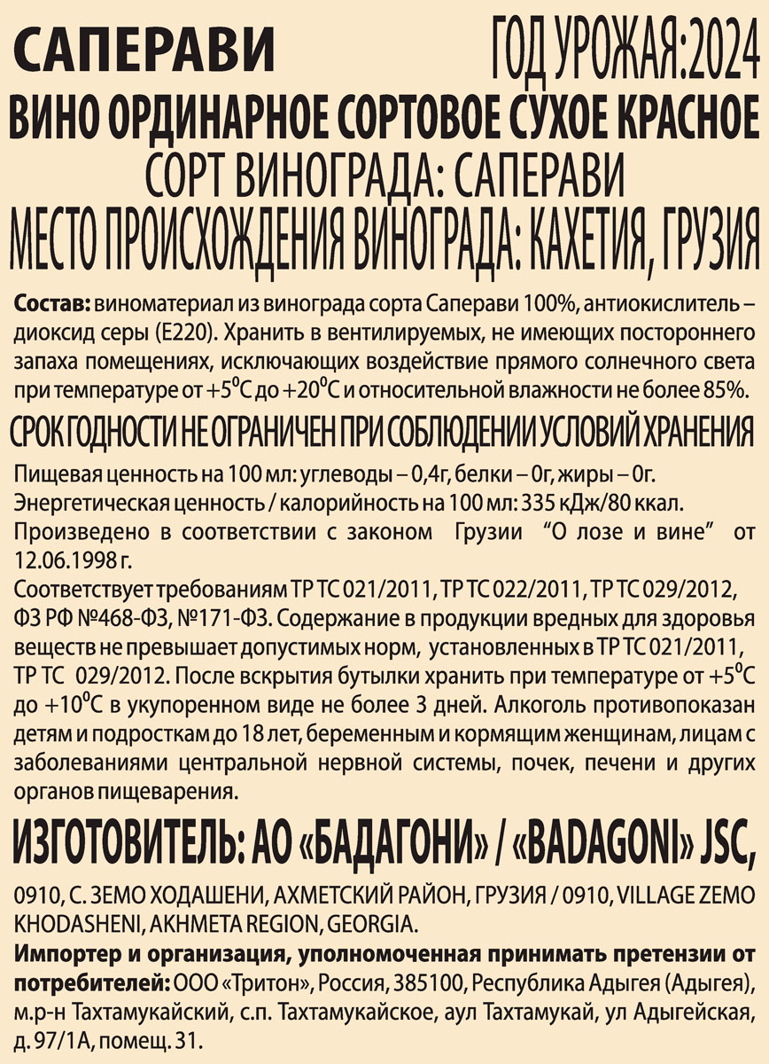 С 2006 года в Алазанской долине работает завод Badagoni и ежегодно производит более трех миллионов бутылок восхитительного вина. Badagoni — грузинское предприятие с профессиональным итальянским оборудованием, производящее вино по древним рецептам виноделия. Вино Saperavi имеет глубокий рубиновый цвет и фиолетовые отблески. В аромате черная вишня, малина и спелая слива. Вкус пряный, приятный, с ярким послевкусием можжевельника и нюансами белого перца. Попробуйте с твердым сыром и бужениной. Рекомендуемая температура подачи: +16–18 °С.