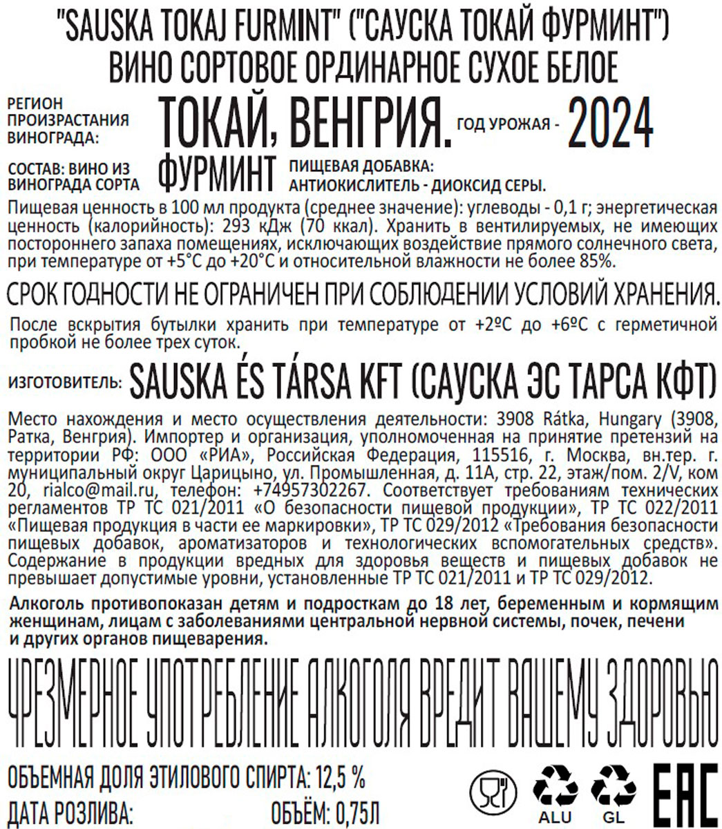Вино Сауска Фурминт Токай белое сухое 0,75 л