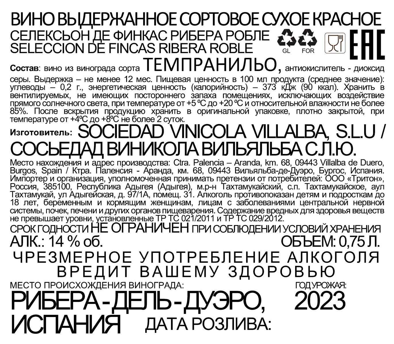 Вино Селексьон де Финкас Рибера Робле красное сухое 0,75 л
