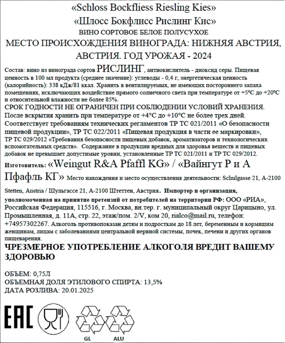 Вино Шлосс Бокфлисс Рислинг Кис белое полусухое 0,75 л