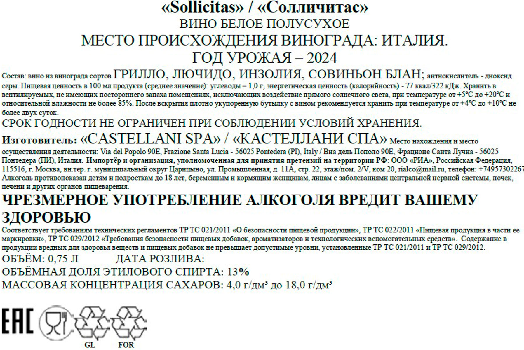 Вино Солличитас белое полусухое 0,75 л