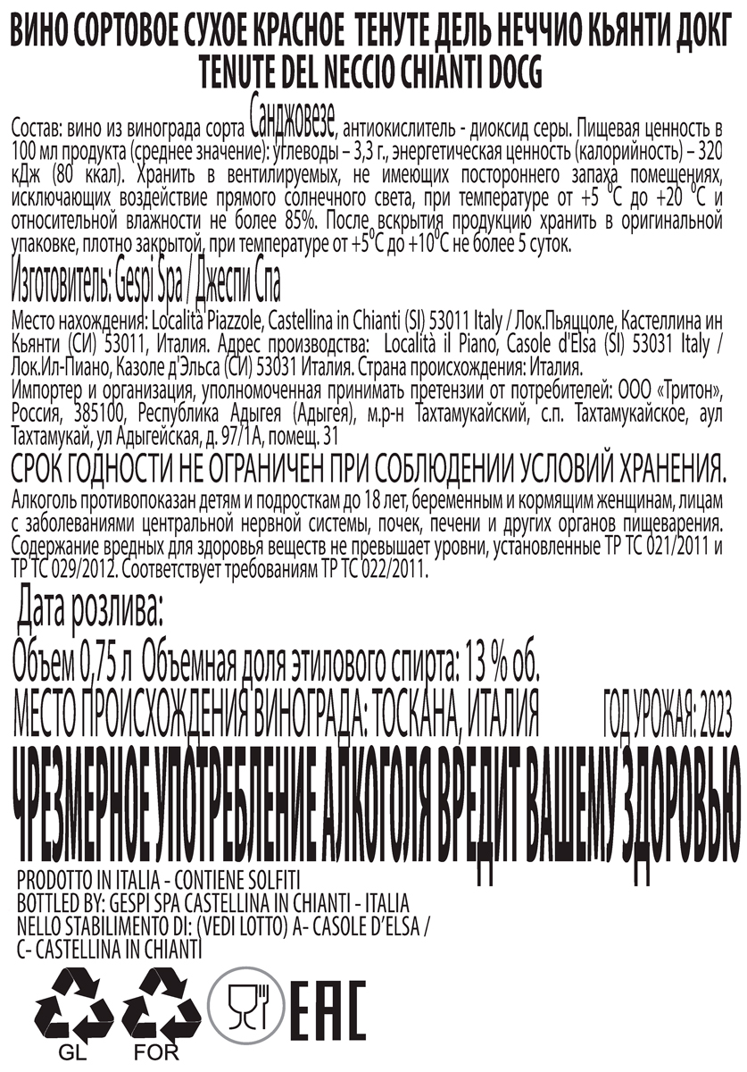 Вино Тенуте Дель Неччио Кьянти красное сухое 0,75 л