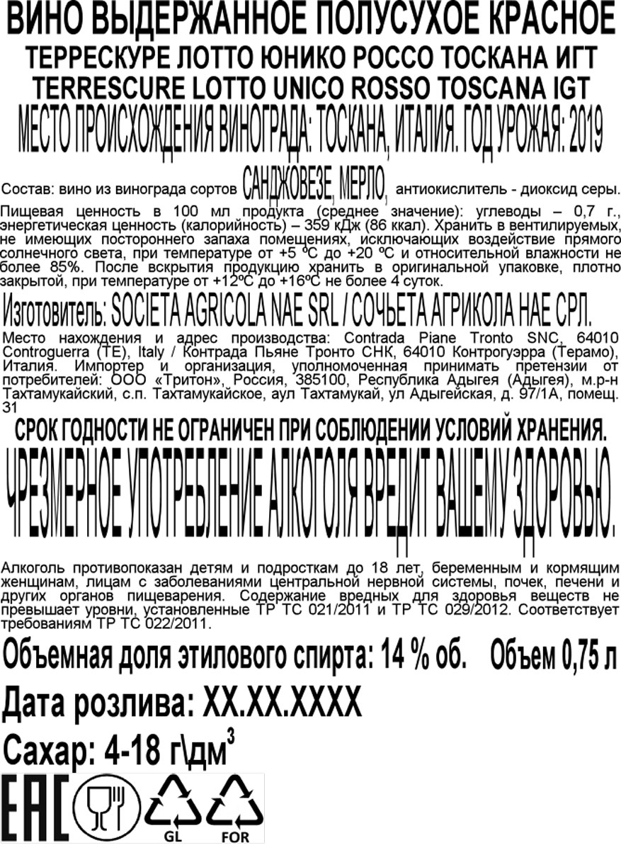 Вино Террескуре Лотто Унико Россо Тоскана красное полусухое 0,75 л