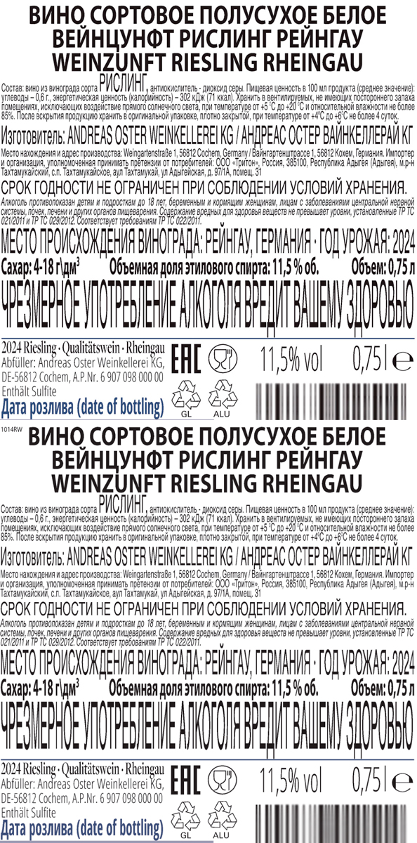 Вино Вейнцунфт Рислинг Рейнгау белое полусухое 0,75 л