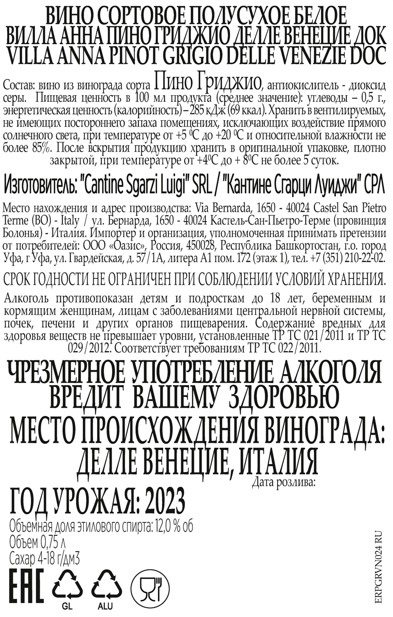Вино Вилла Анна Пино Гриджио Делле Венецие белое полусухое 0,75 л