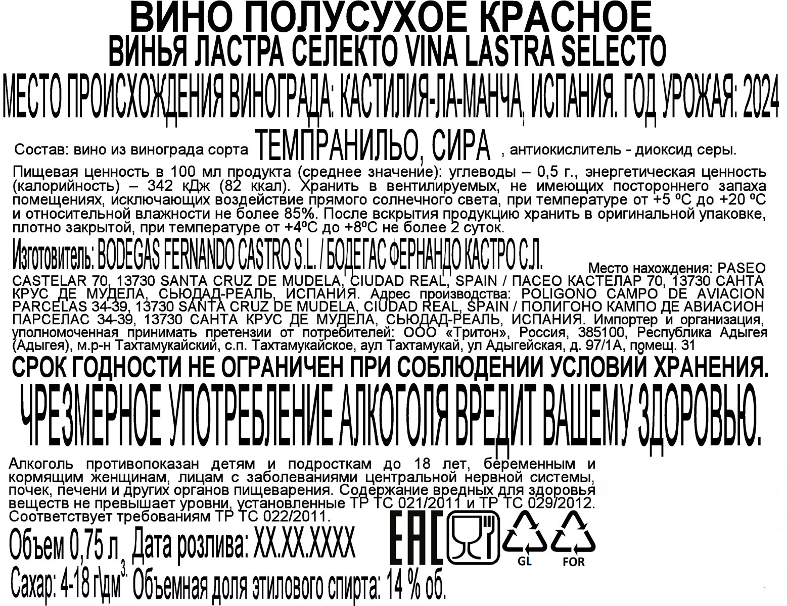 Вино Винья Ластра Селекто красное полусухое 0,75 л