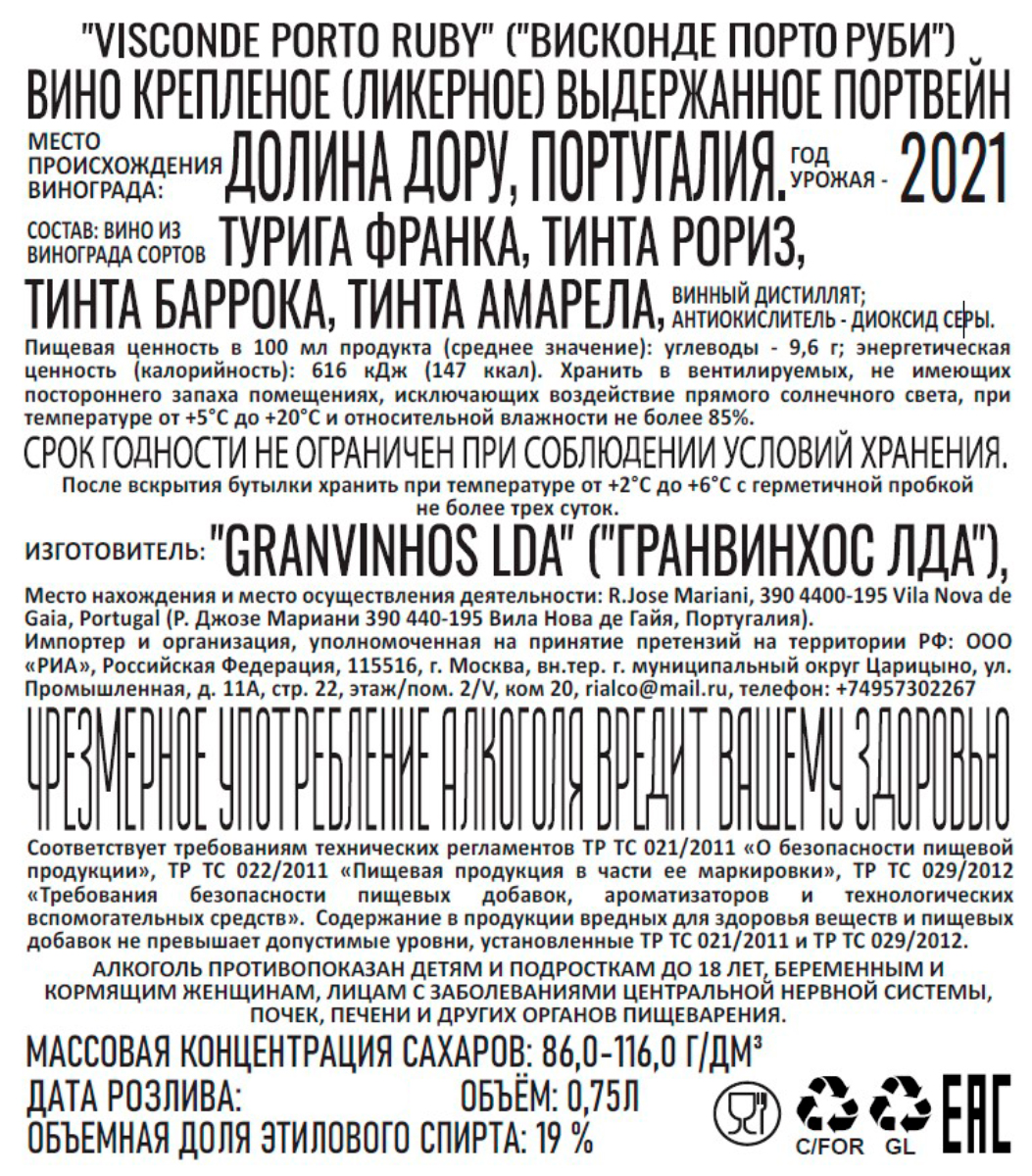 Вино Висконде Порто Портвейн Руби ликерное крепленое 0,75 л