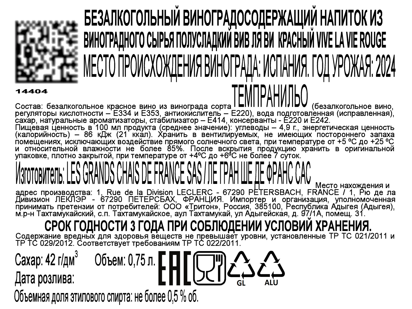 Напиток виноградосодержащий Вив ля Ви красный полусладкий безалкогольный 0,75 л