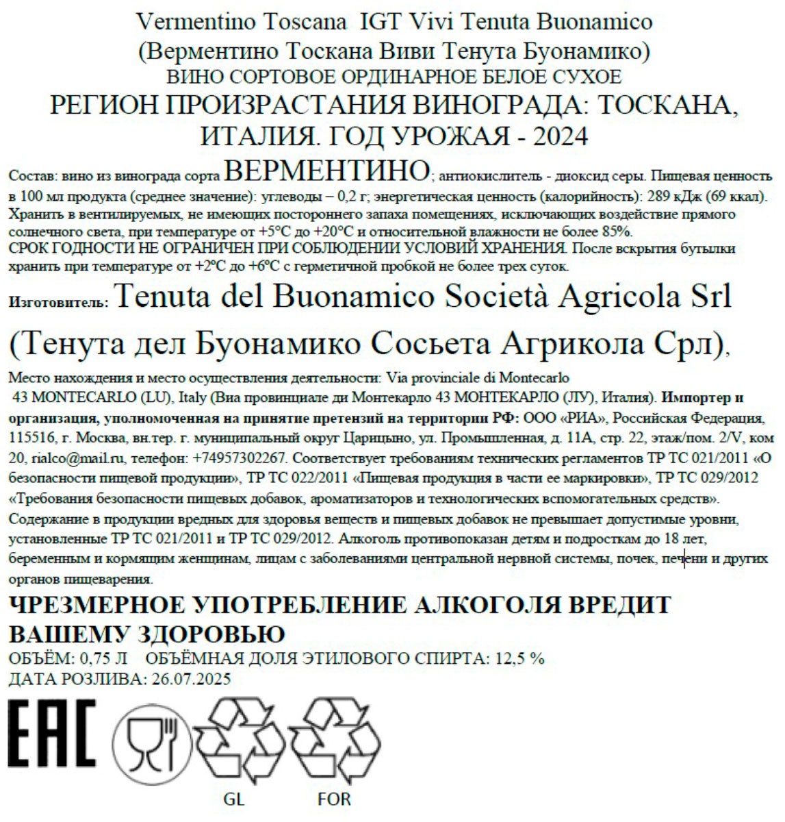 Вино Буонамико Верментино Тоскана белое сухое 0,75 л