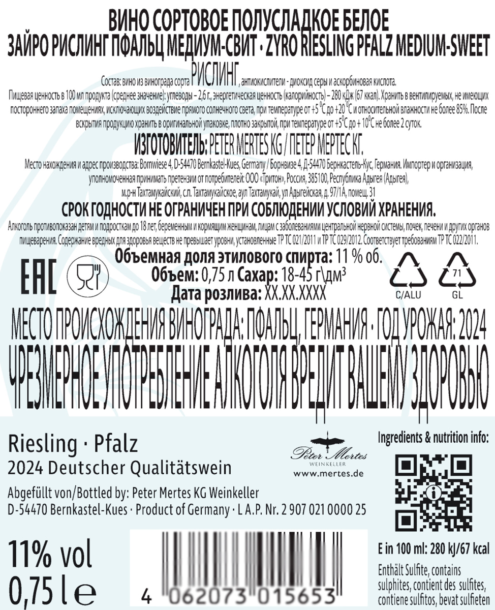 Вино Зайро Рислинг Пфальц Медиум Свит белое полусладкое 0,75 л