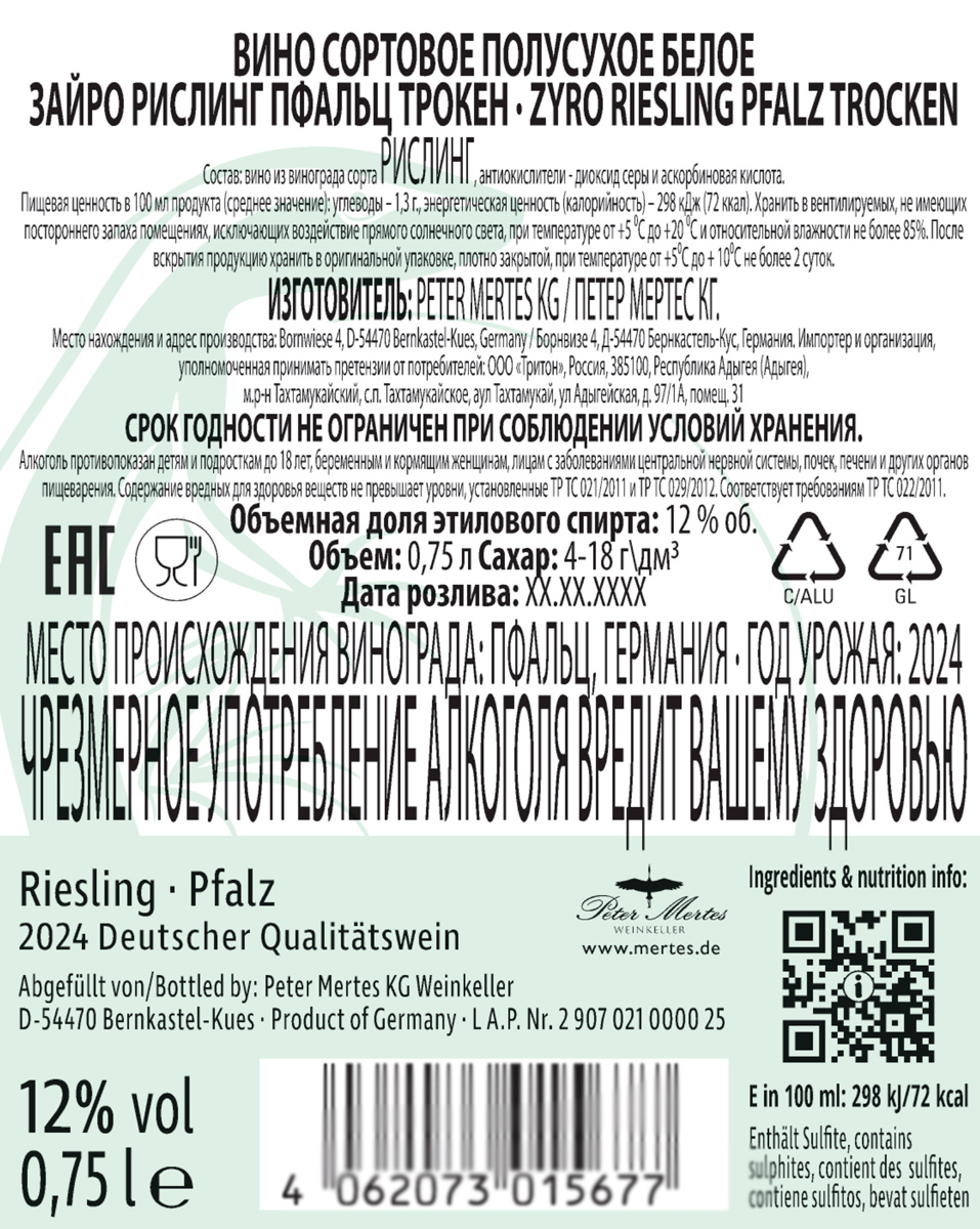 Вино Зайро Рислинг Пфальц Трокен белое полусухое 0,75 л