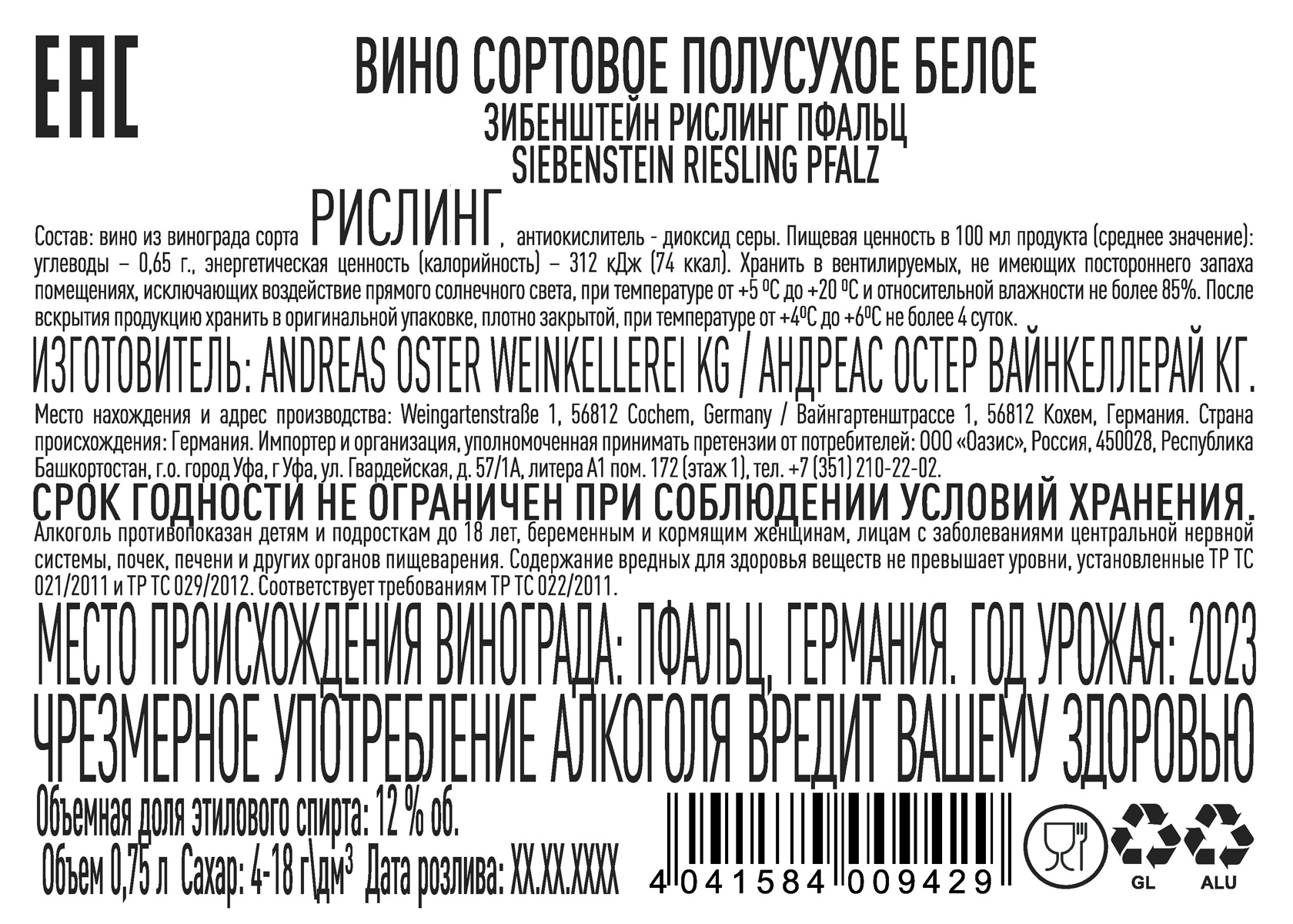 Вино Зибенштейн Рислинг Пфальц белое полусухое 0,75 л