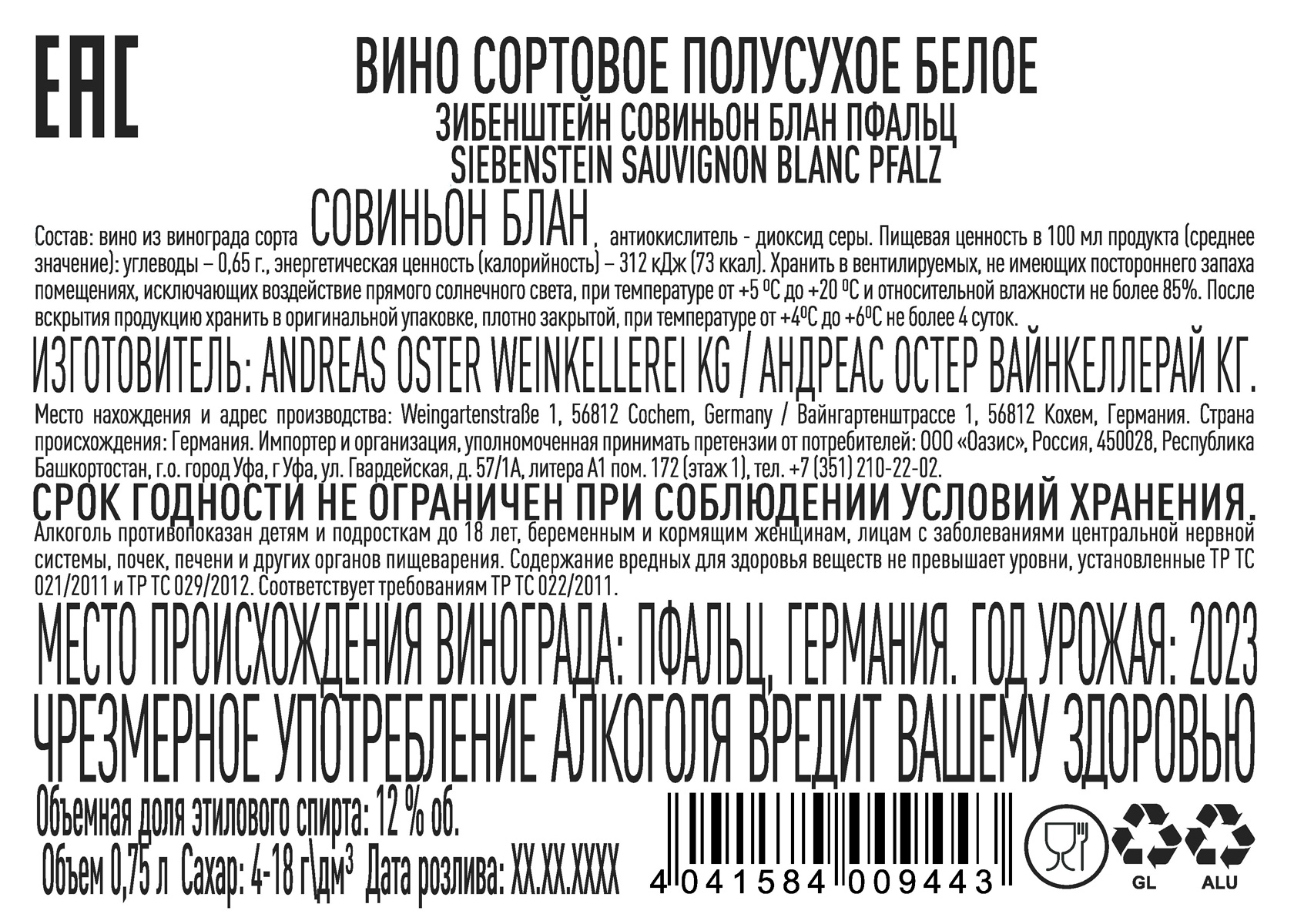 Вино Зибенштейн Совиньон Блан Пфальц белое полусухое 0,75 л