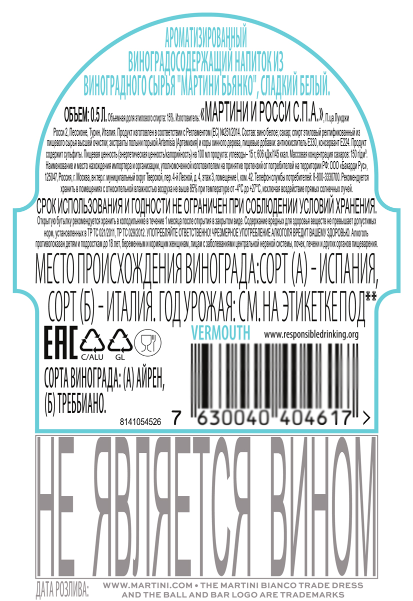 Напиток виноградосодержащий Мартини Бьянко белый сладкий 0,5 л