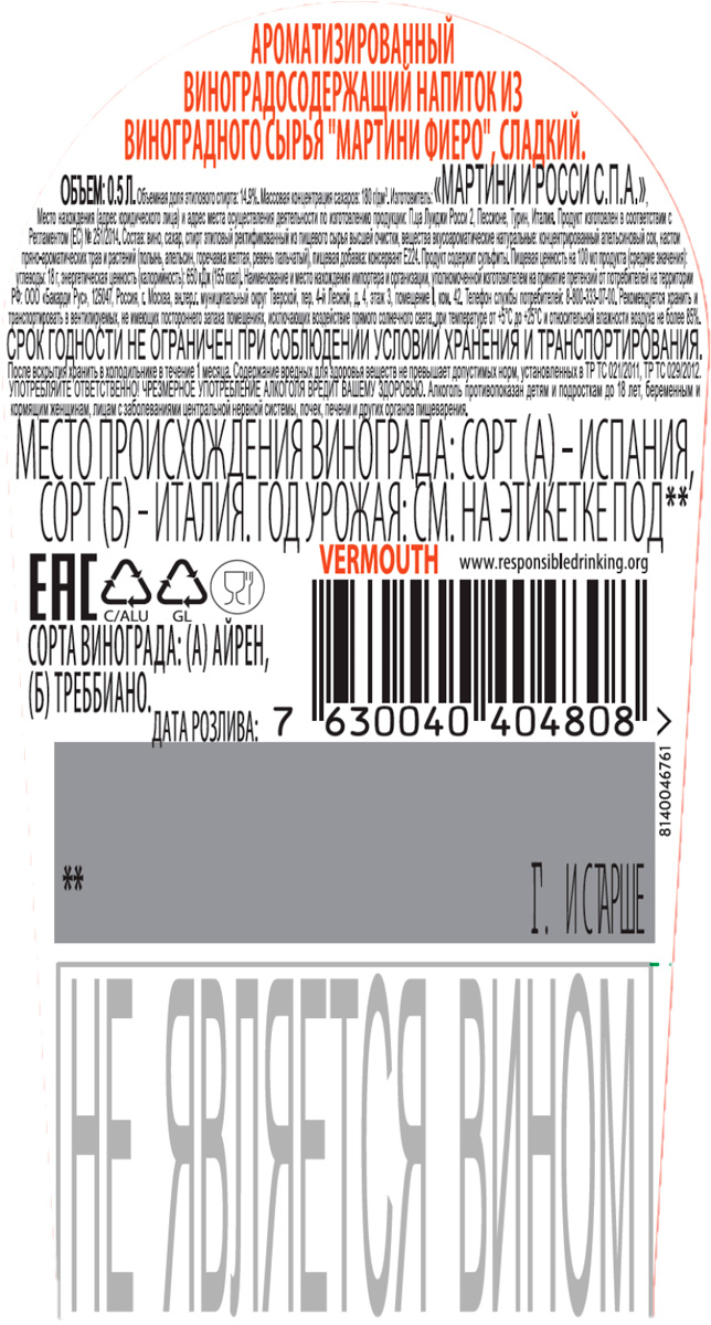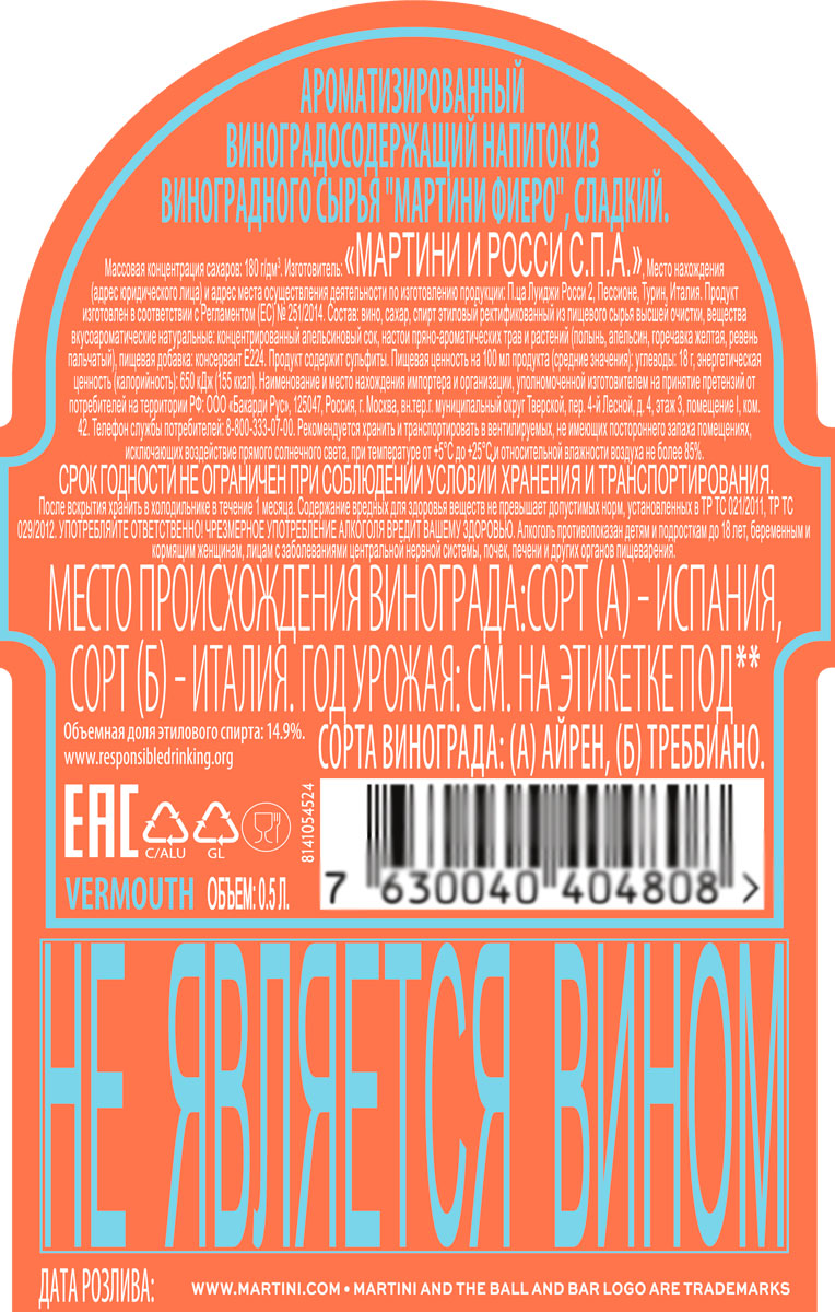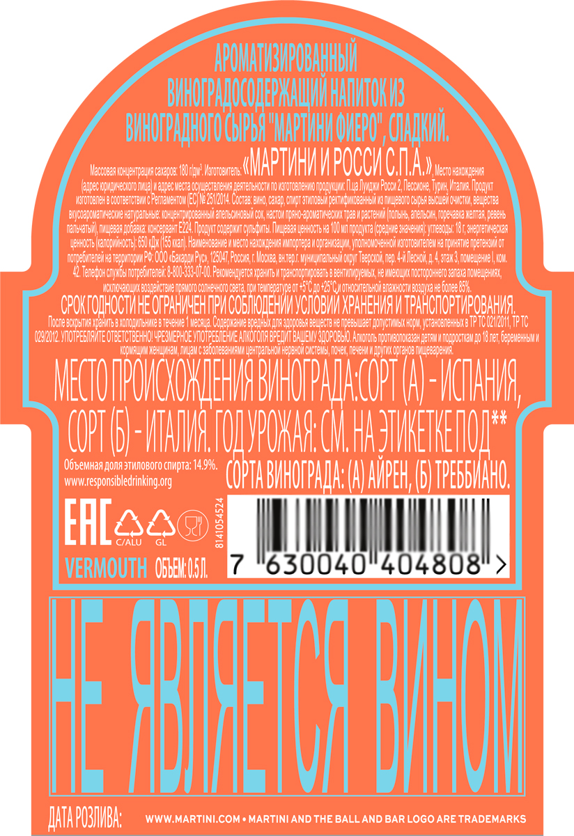 Напиток ароматизированный виноградосодержащий Мартини Фиеро сладкий 0,5 л