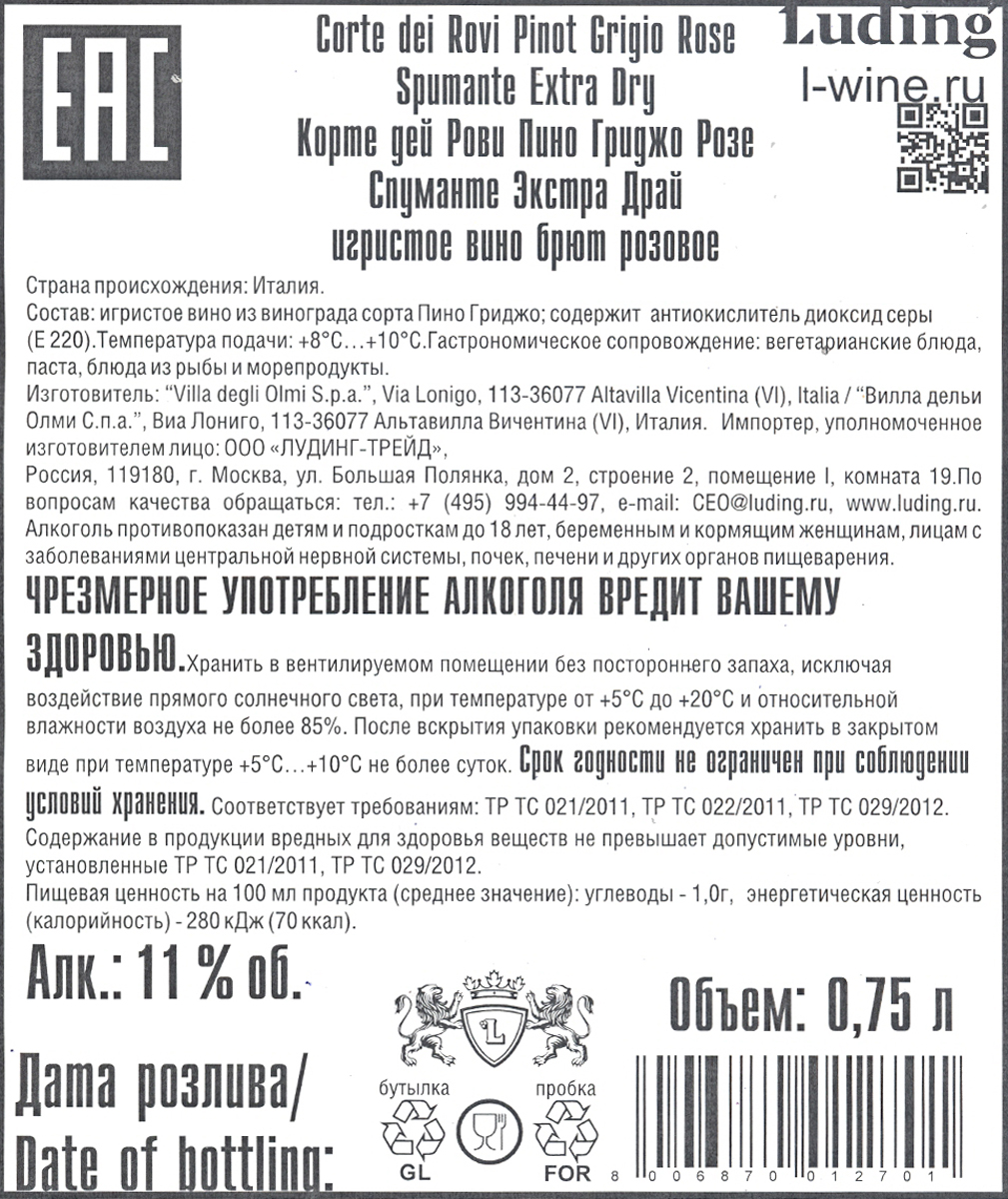 Вино игристое Корте дей Рови Пино Гриджо Розе Спуманте Экстра Драй розовое брют