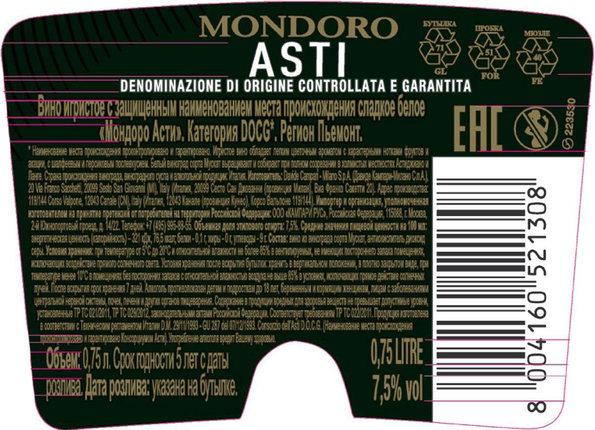 Замечательная конфетка. Прекрасный образец душистого сорта Мускат белый. Тонкие и ровные пузырьки. Цвет насыщенный, такой же вкус. Идеально для праздников. Люблю вина из Пьемонта, особенно из региона Асти!
