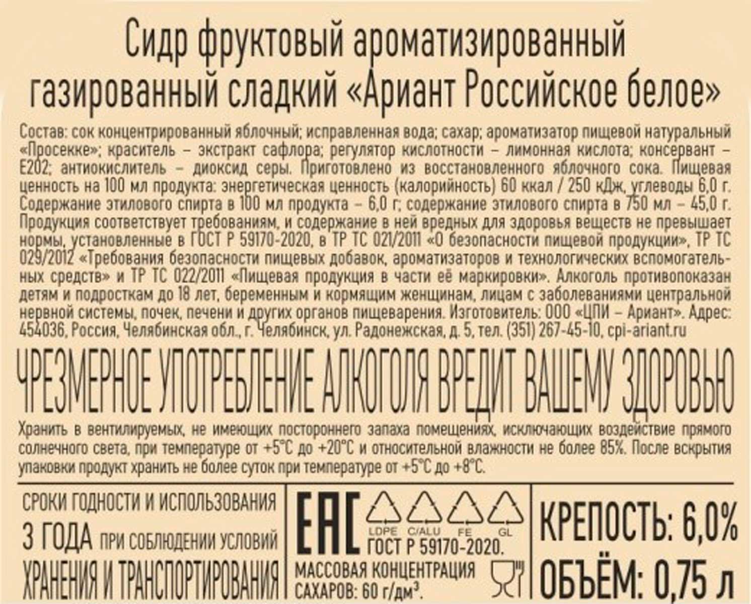 Сидр Ариант Российское белое сладкий