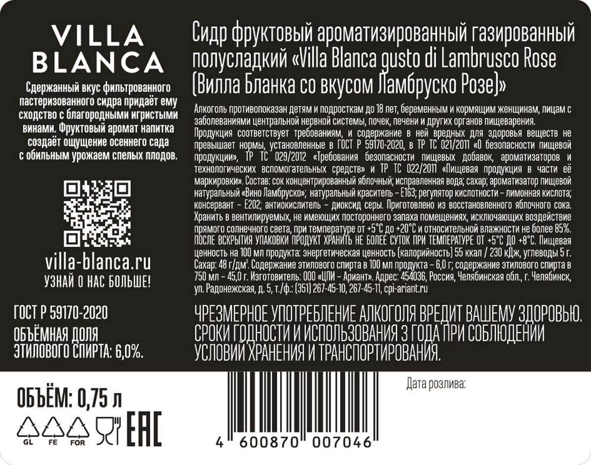 Сидр Вилла Бланка Ламбруско Розе полусладкий 0,75 л