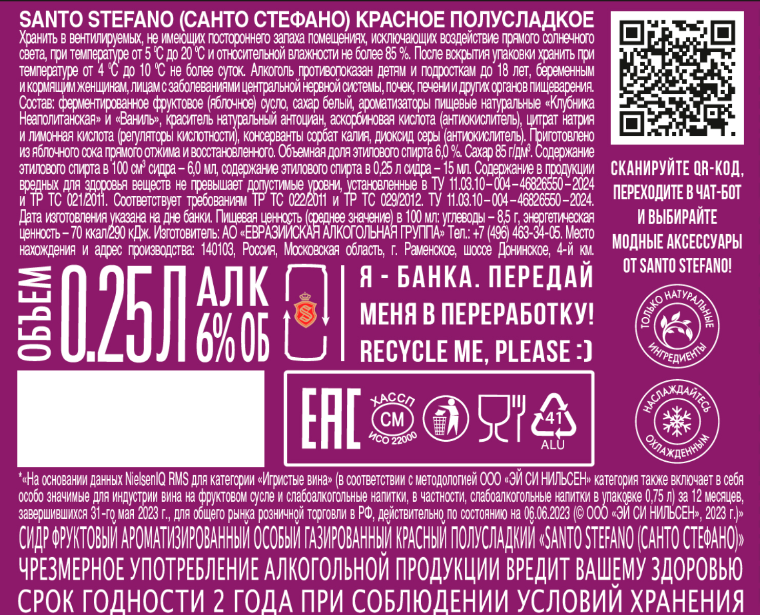 Фруктовый сидр светло-красного цвета со слаженным букетом с тонами красного винограда и полным, гармоничным вкусом.