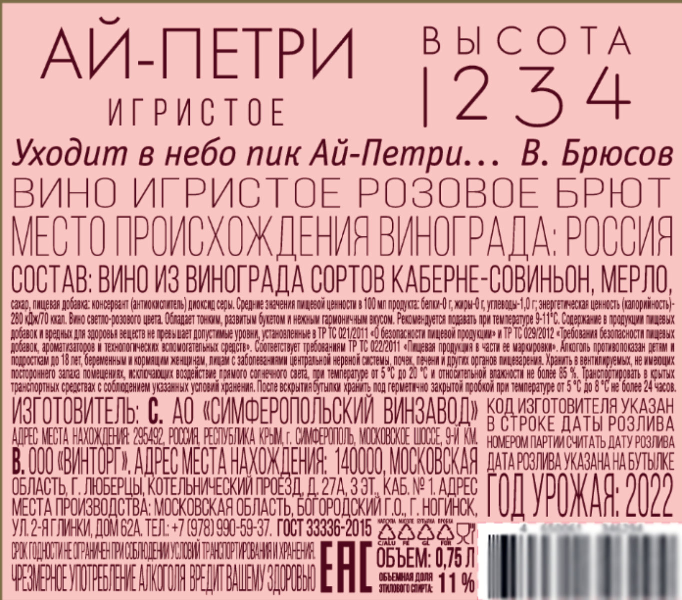 Вино игристое Ай Петри Высота 1234 розовое брют
