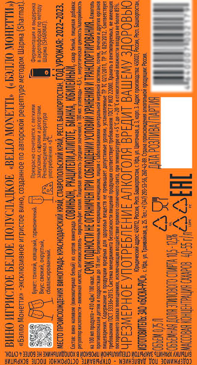 Лёгкое игристое вино с локальным характером. Обладает нежным букетом и вкусом с приятными нотами жёлтого яблока с цветочно-медовыми оттенками. При производстве Bello Monetti используются башкирские сорта винограда.