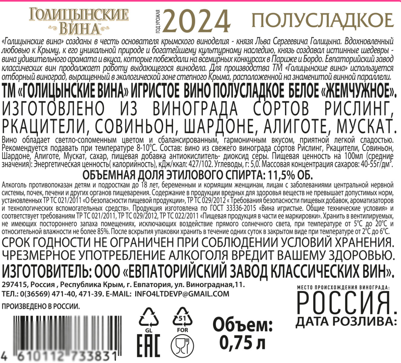 Вино обладает светло-соломенным цветом и сбалансированным, гармоничным вкусом, приятной легкой сладостью. «Голицынские вина» выпускаются на одном из старейших заводов Крыма — «Заводе классических вин». Это вино изготовлено из винограда сортов Рислинг, Ркацители, Совиньон, Шардоне, Алиготе, Мускат. Хорошо проявит себя с морепродуктами, мягким сыром и свежими фруктами. Рекомендуется подавать при температуре 8-10 °С.