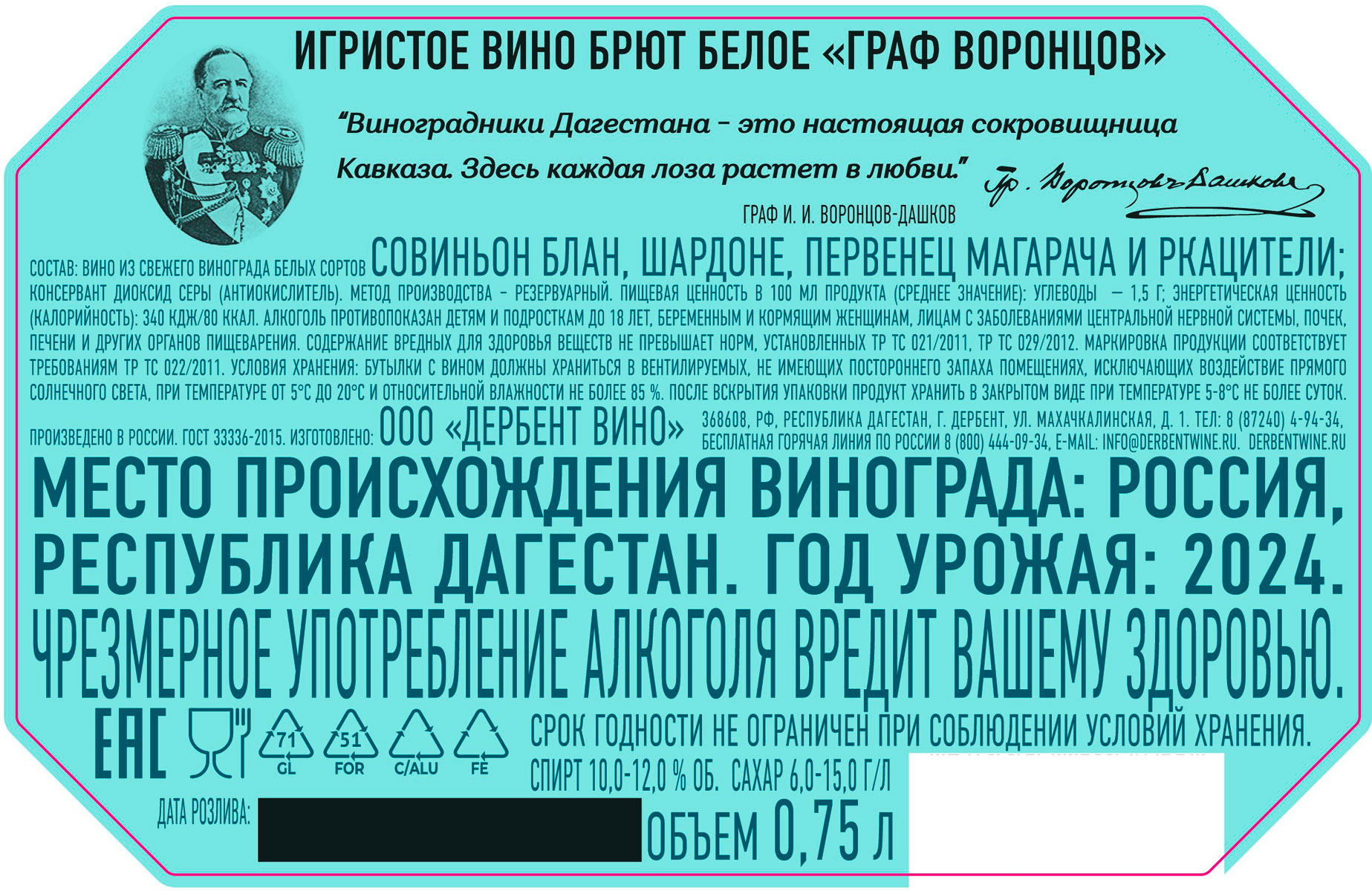 Вино игристое Граф Воронцов белое брют 0,75 л