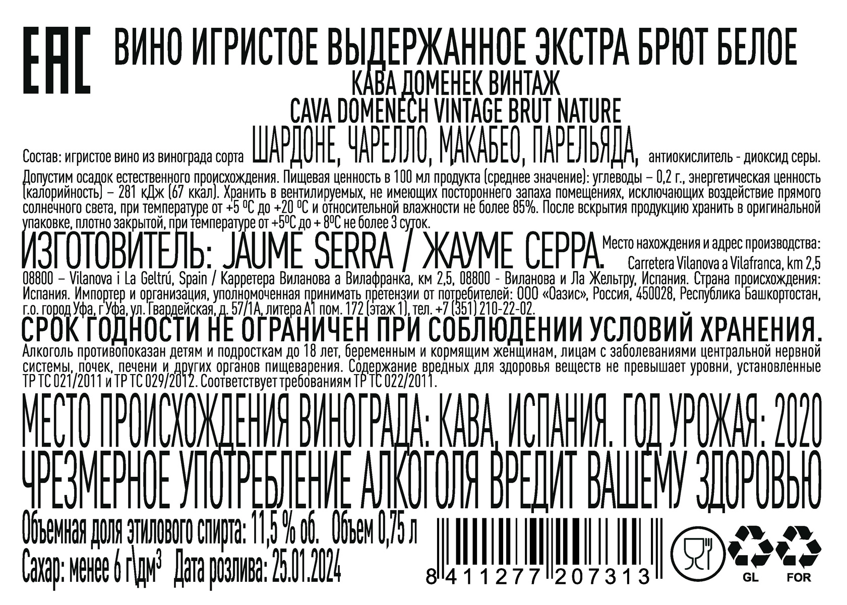 Вино игристое Кава Доменек Винтаж белое экстра брют 0,75 л