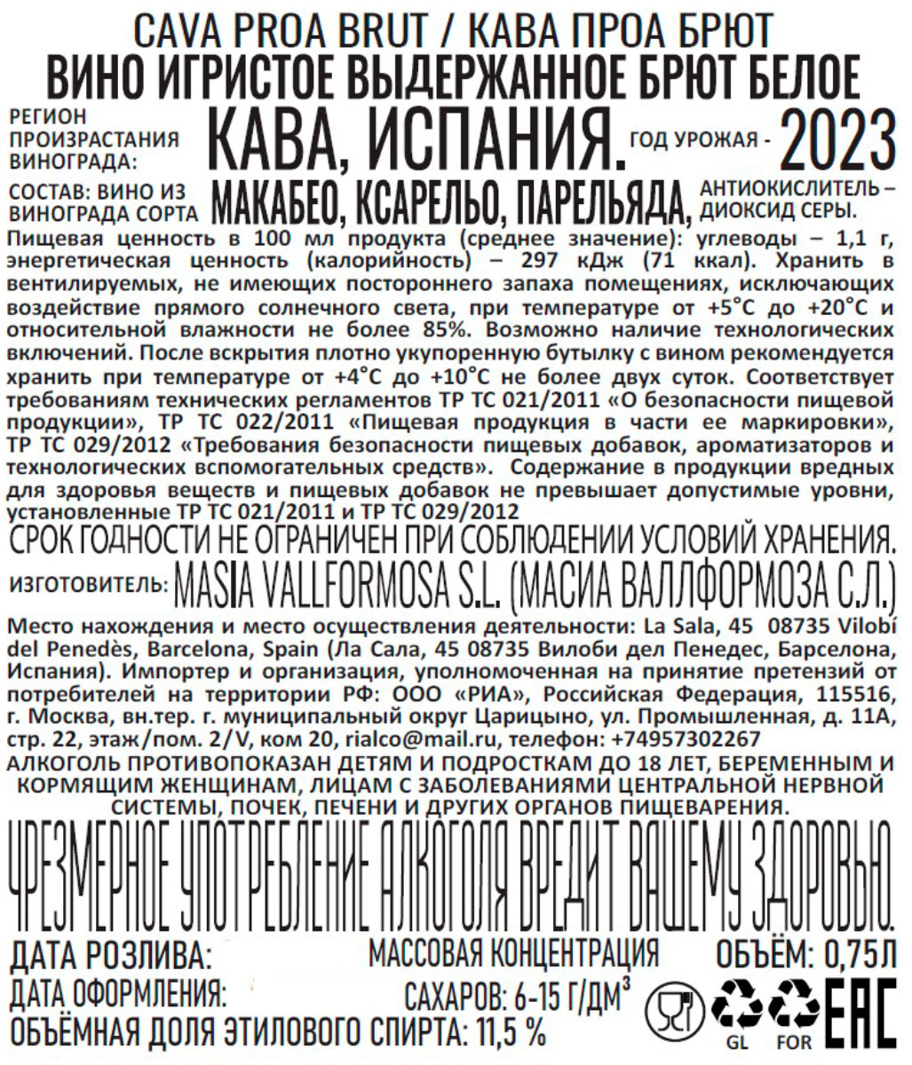 Вино игристое Кава Проа белое брют 0,75 л