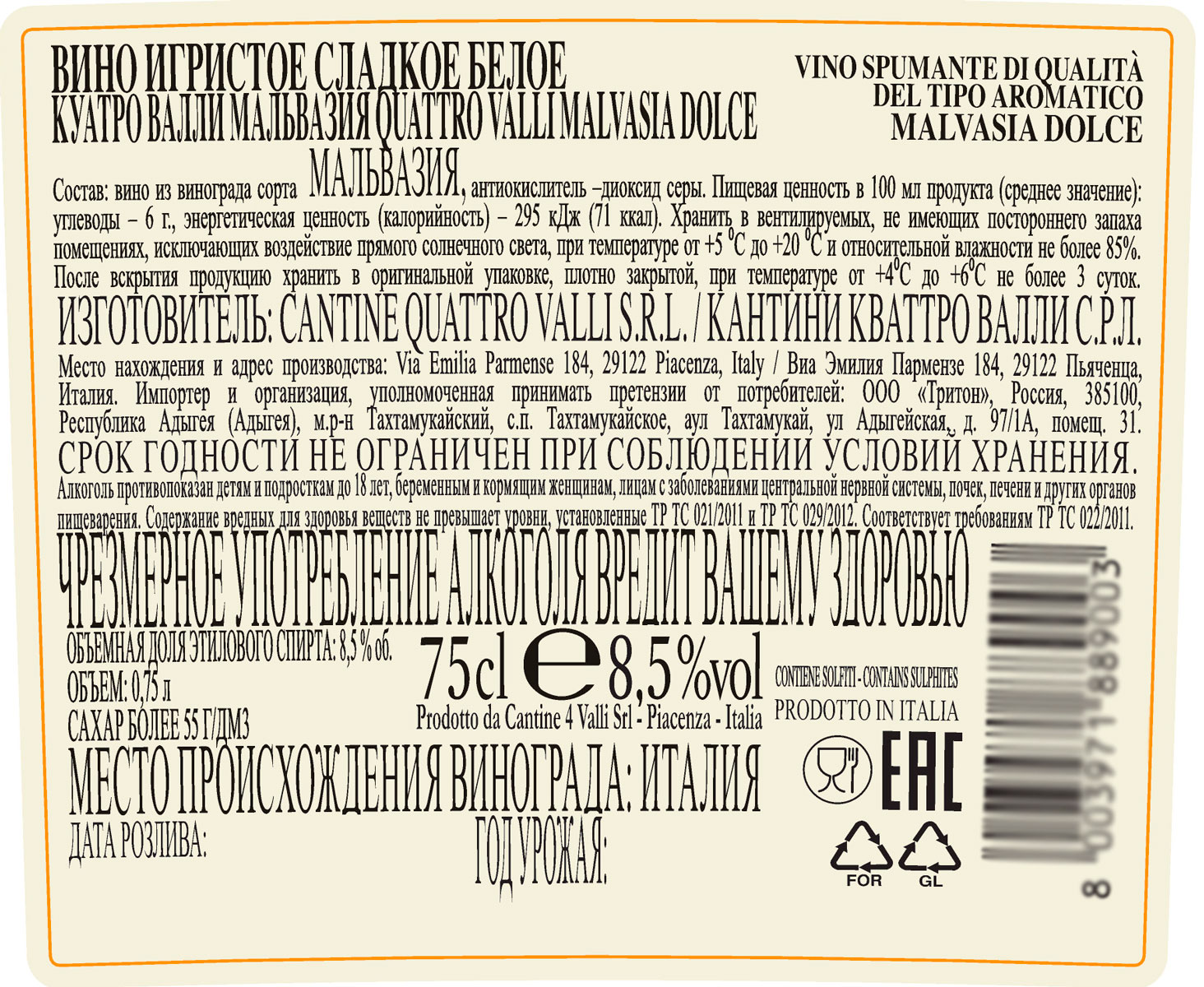 Вино игристое Куатро Валли Мальвазия белое сладкое 0,75 л
