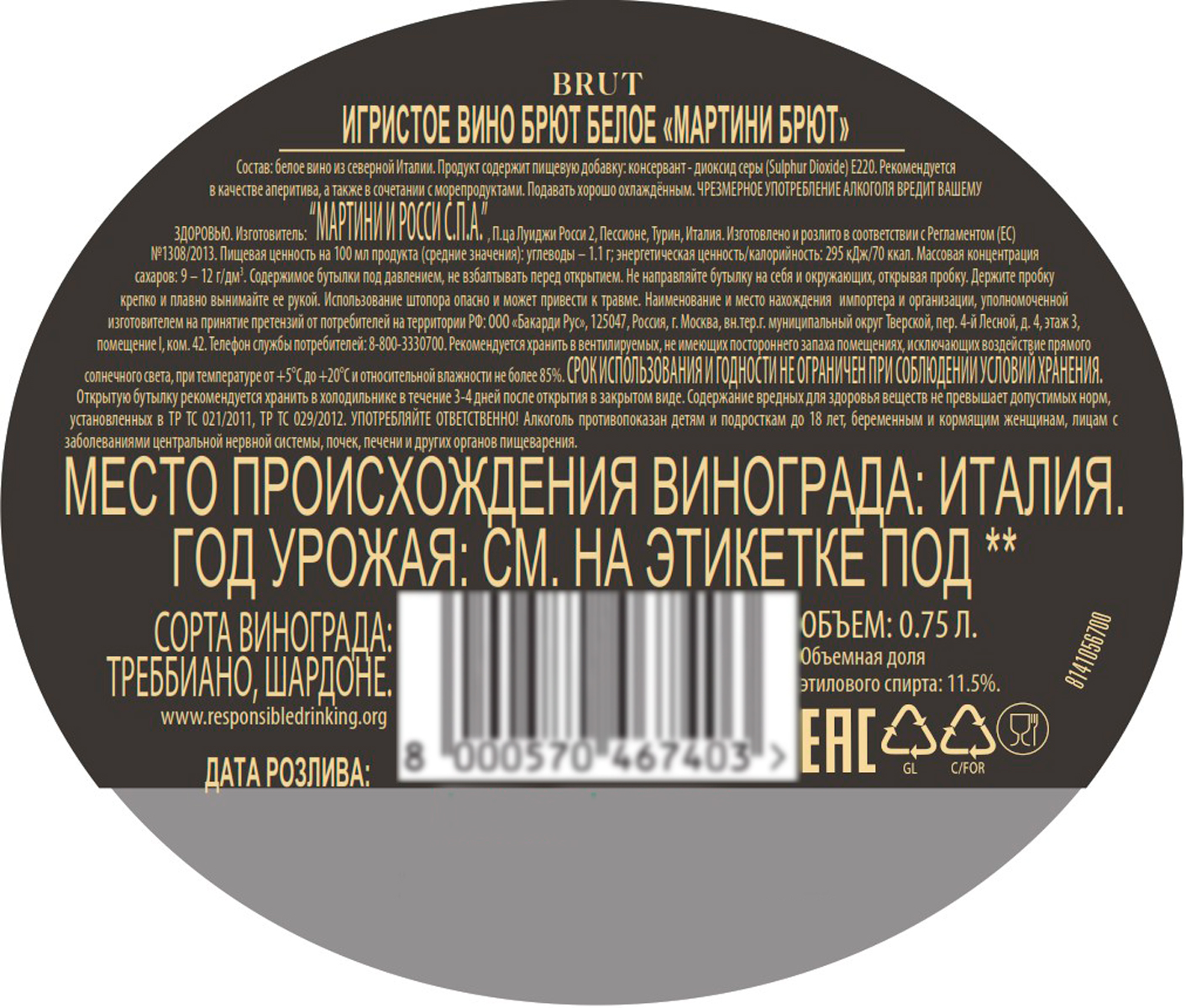 Вино игристое Мартини Брют белое брют 0,75 л