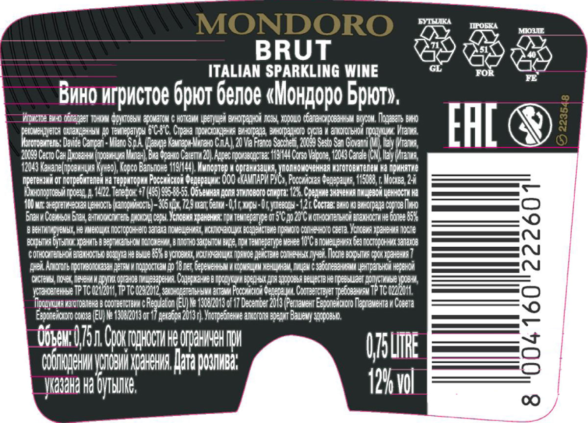 Вино игристое Мондоро Брют белое брют 0,75 л