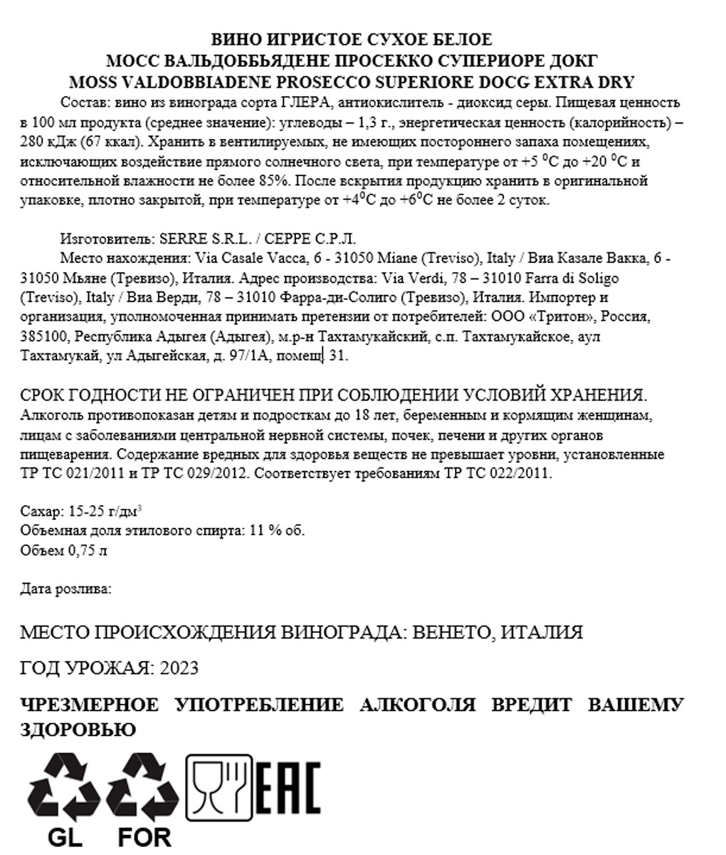 Вино игристое Мосс Просекко Вальдоббьядене Супериоре белое сухое 0,75 л