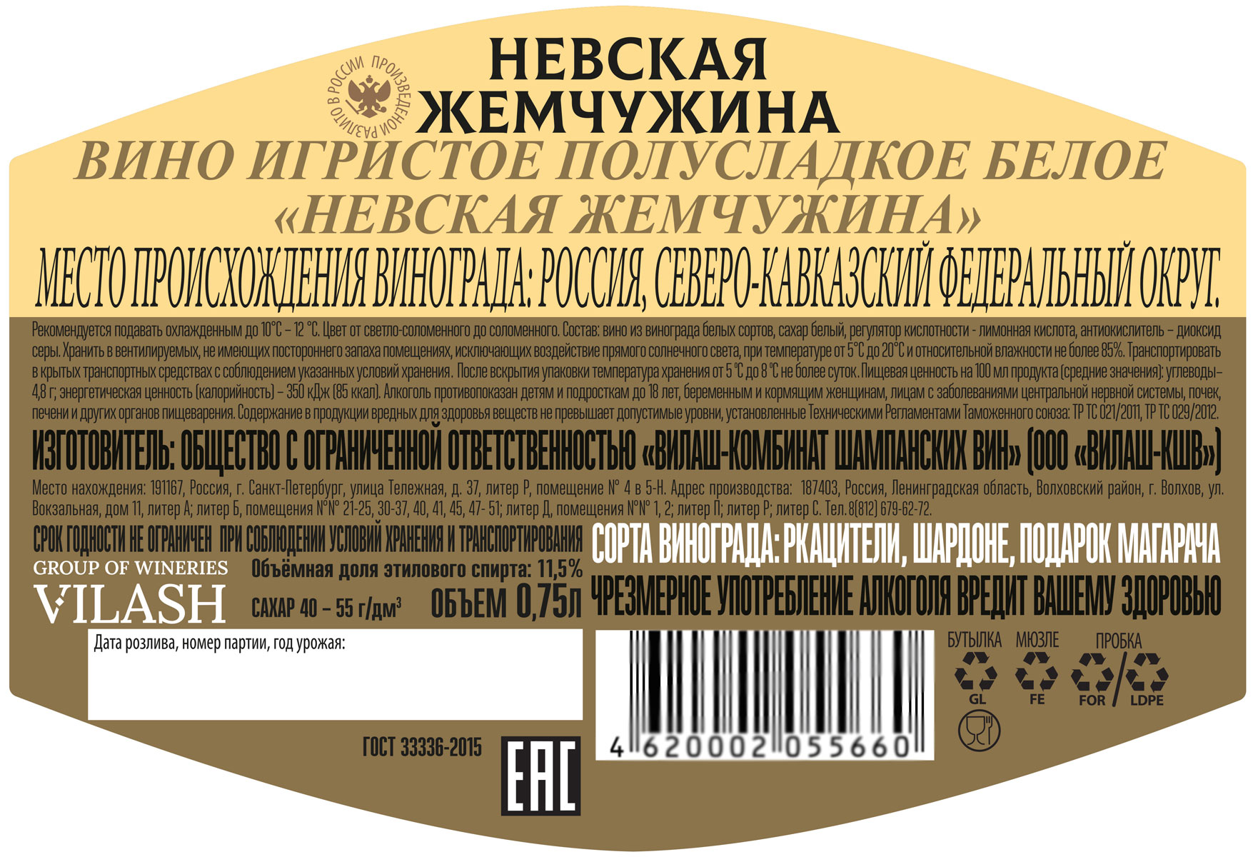 Невская Жемчужина белое полусладкое