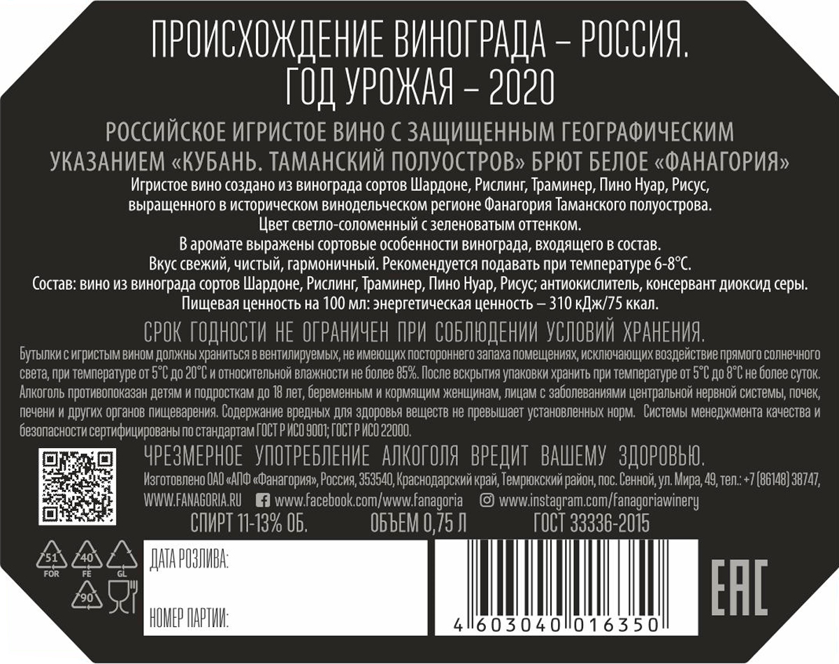 Вино игристое Российское Фанагория белое брют 0,75 л