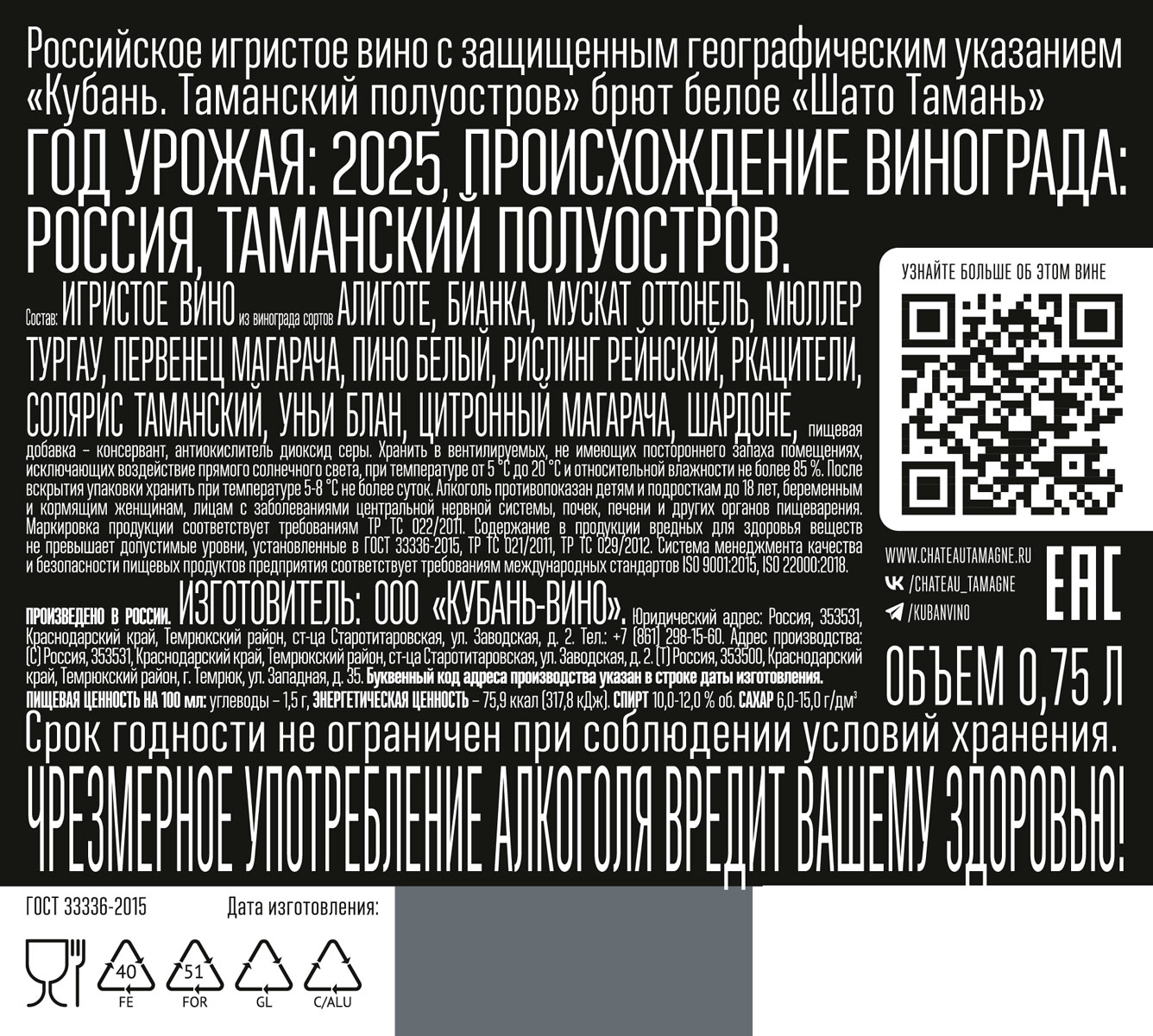 Вино игристое Шато Тамань белое брют 0,75 л