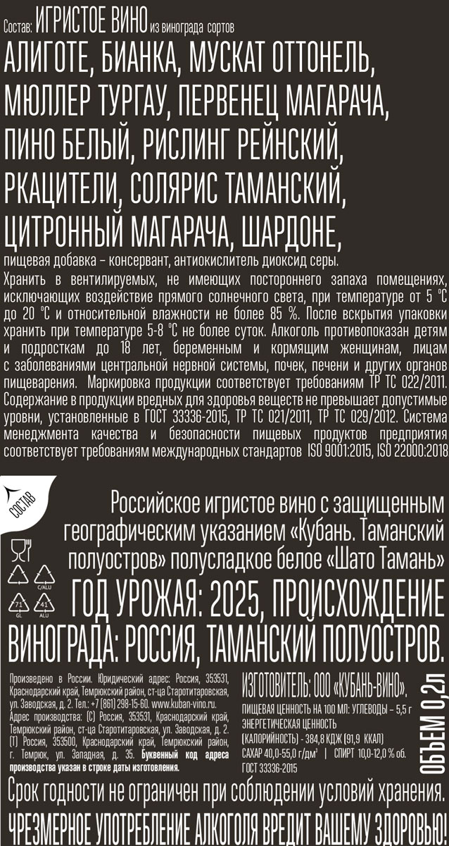 Вино игристое Шато Тамань белое полусладкое 0,2 л