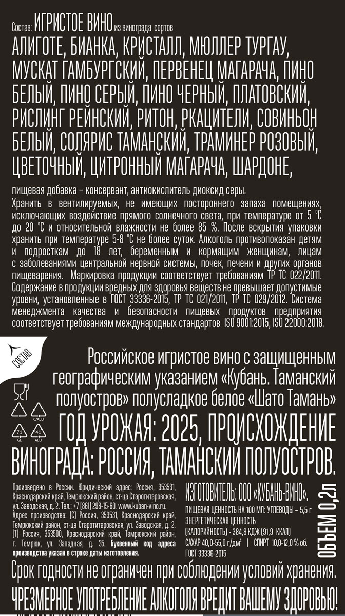 Вино игристое Российское Шато Тамань белое полусладкое 0,2 л
