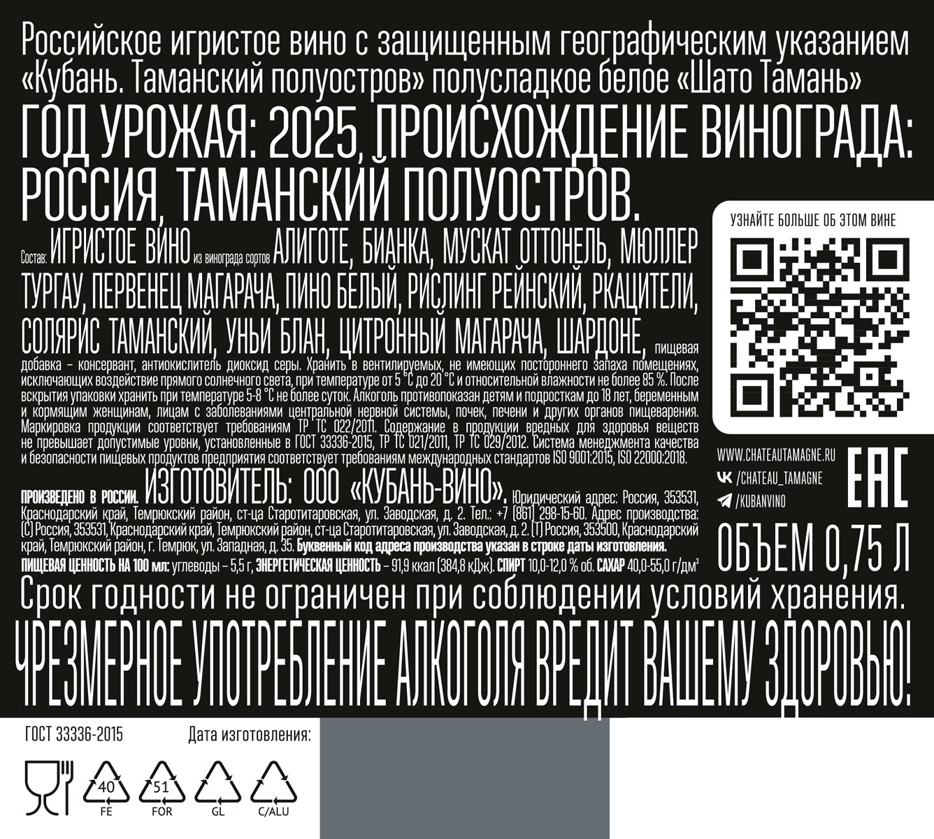 Вино игристое Шато Тамань белое полусладкое 0,75 л