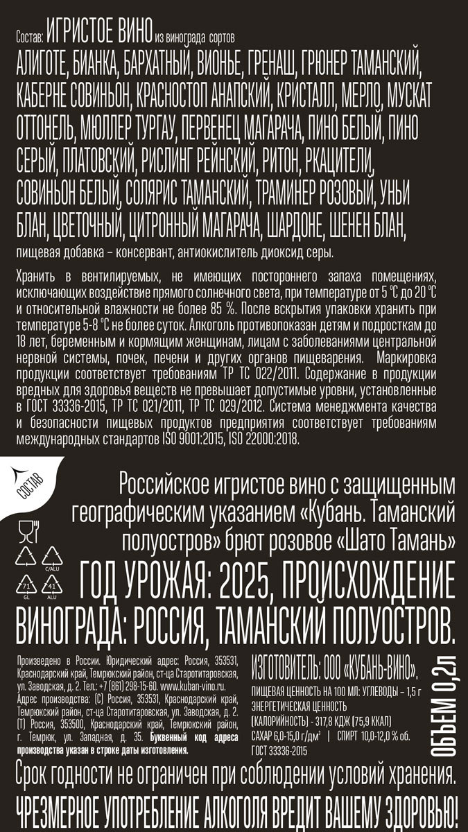Вино игристое Российское Шато Тамань розовое брют 0,2 л