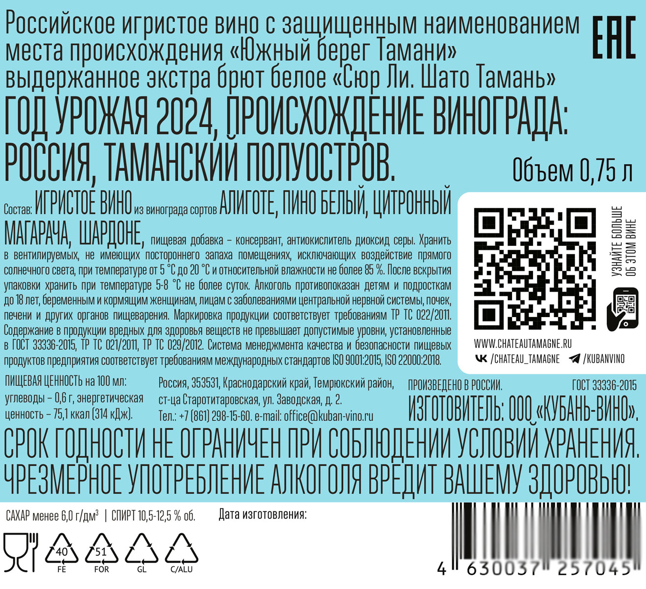 Вино игристое Шато Тамань Сюр Ли белое экстра брют 0,75 л