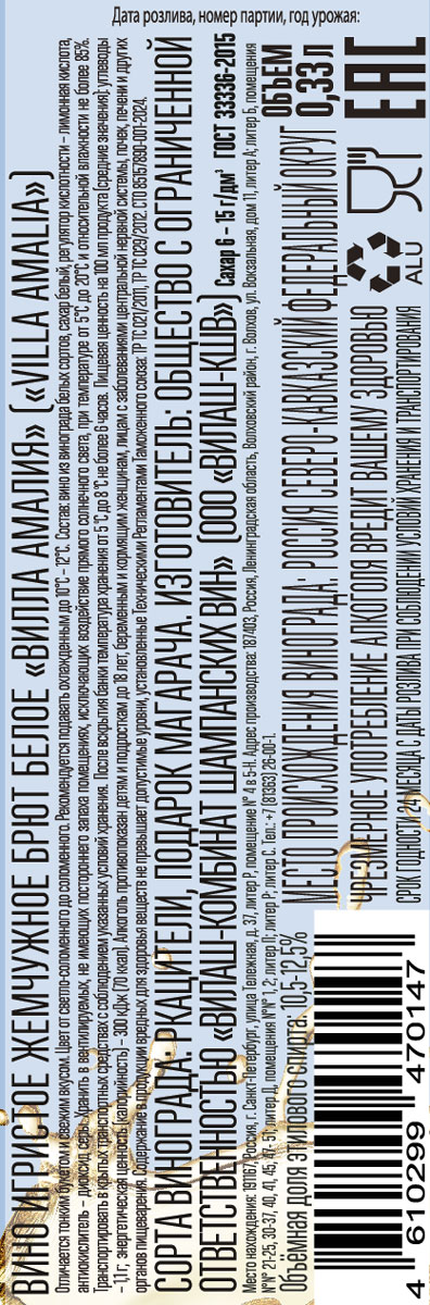 Вино игристое Вилла Амалия белое брют 0,33 л