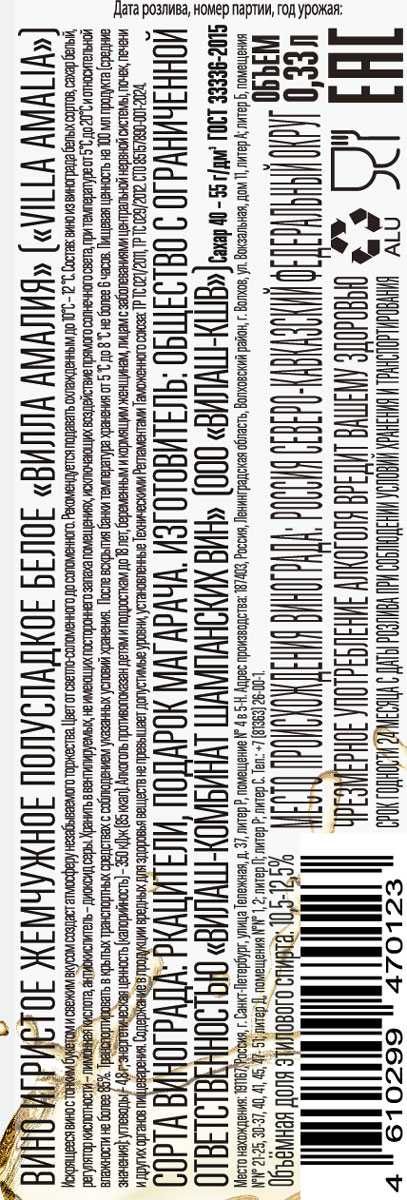 Вино игристое Вилла Амалия белое полусладкое 0,33 л