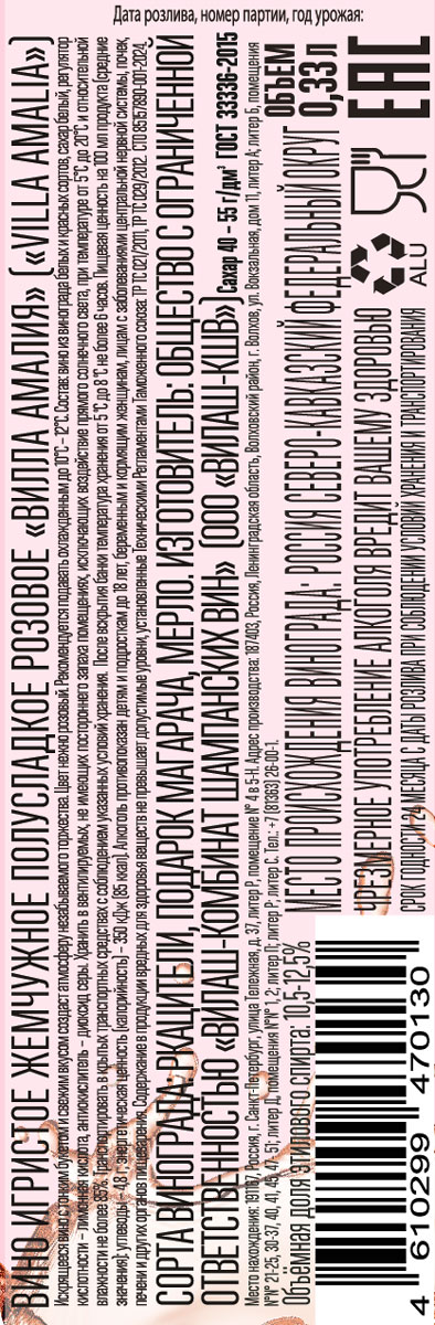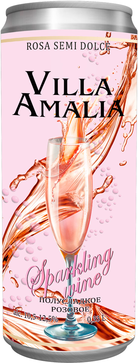 Розовое полусладкое игристое вино Villa Amalia. Свежее в аромате, с нотами красных ягод. Вкус нежный, с нюансами земляники и интенсивными пузырьками. Подойдет к мягким сырам, фруктовому желе и чизкейку. Подавать рекомендуется хорошо охлажденным до 8–10 °С.